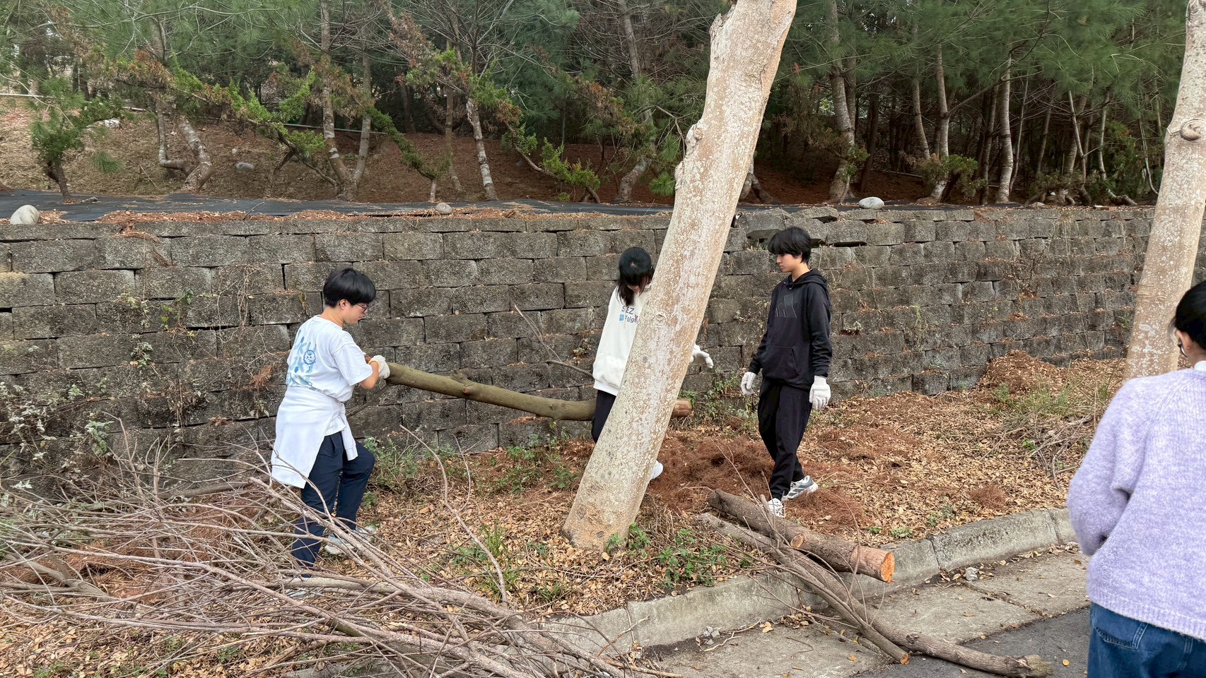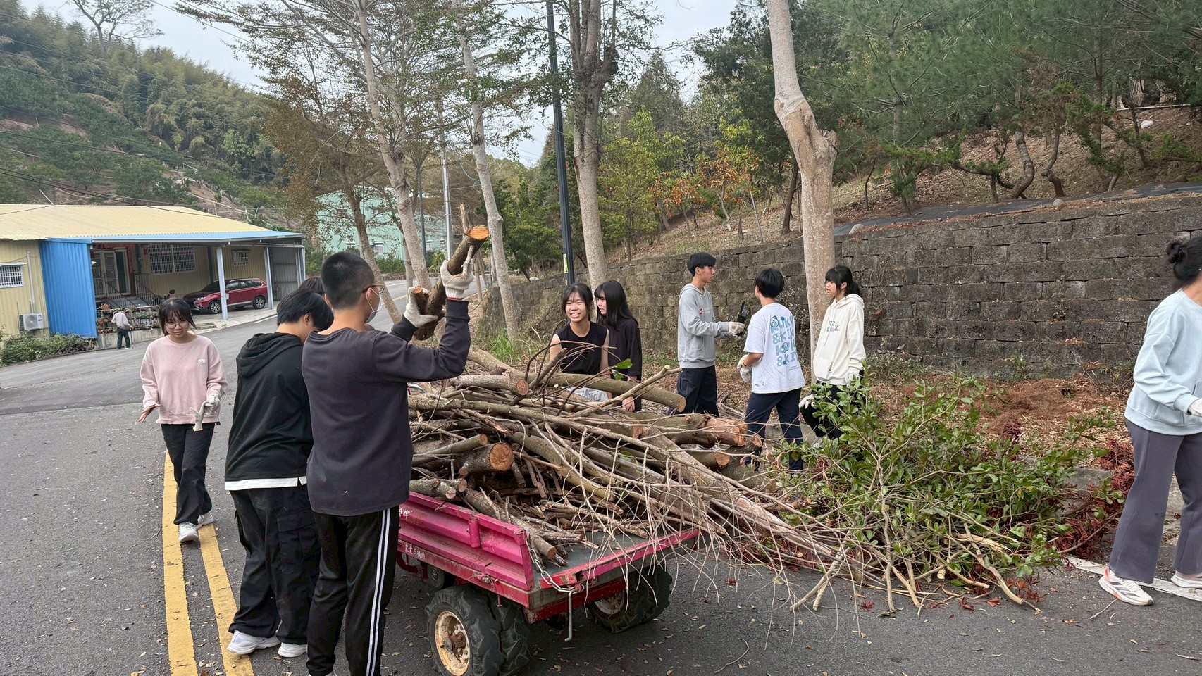 同學們一到現場,便迅速分工合作,協助清理園區聯外道路上的落葉與樹枝。儘管天氣微涼,工作內容看似簡單卻相當耗費體力,大家仍始終保持笑容,在勞動過程中發揮良好的團隊合作默契。透過掃地、撿拾與整理,使本園聯外道路變得更加整潔與安全。